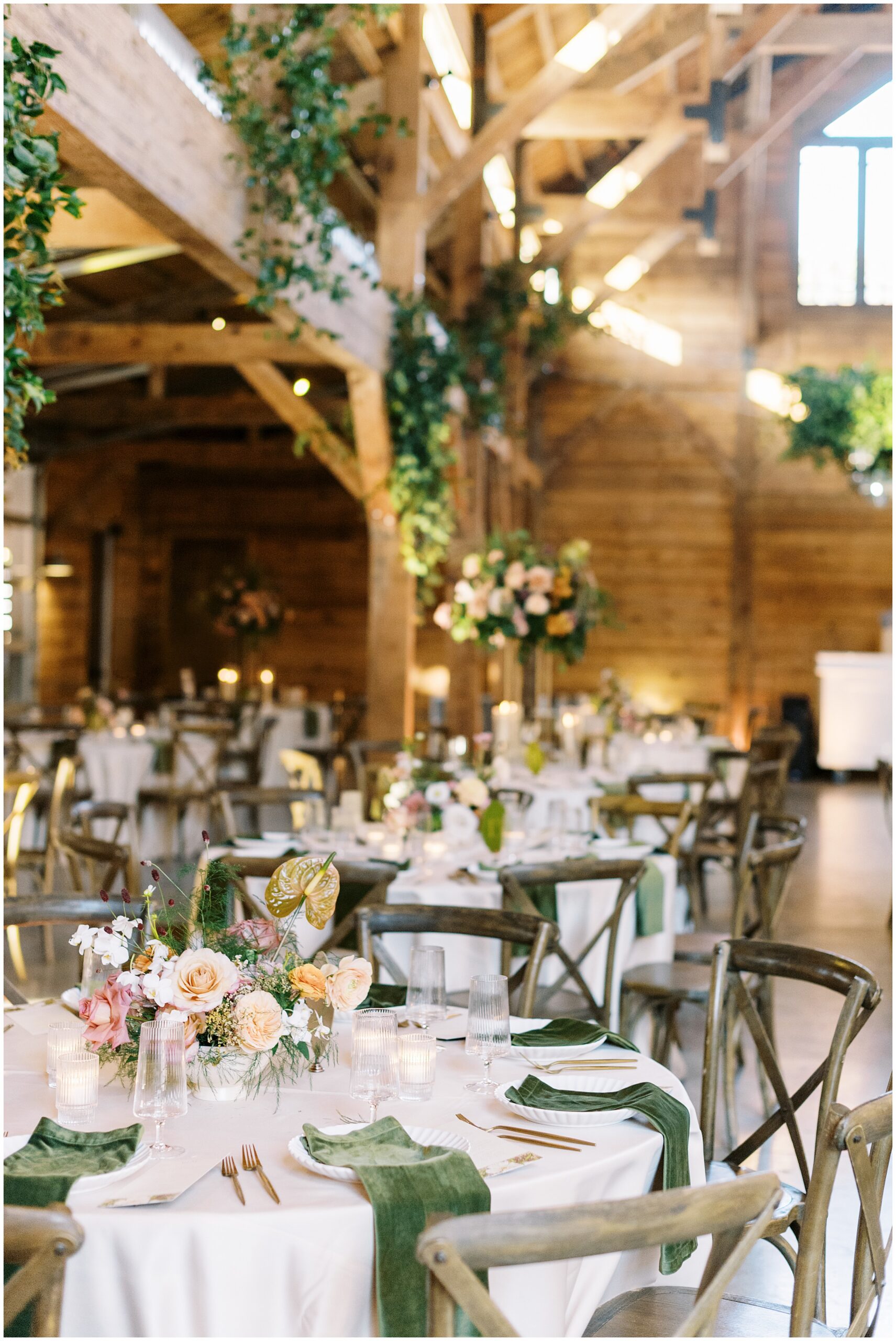 As the evening continues, everyone moves indoors to the reception space. The barn is beautifully designed with warm wood tones, exposed beams, large chandeliers, and an elevated rustic feel. Large windows on each end bring in the last of the evening light before transitioning into a cozy, ambient glow for dinner and dancing. The romance can be upped even more with candles flickering and some greenery that always pops in the space. It’s also a large space that is great for larger guest counts of up to 300 loved ones.
